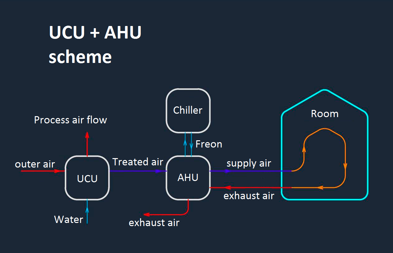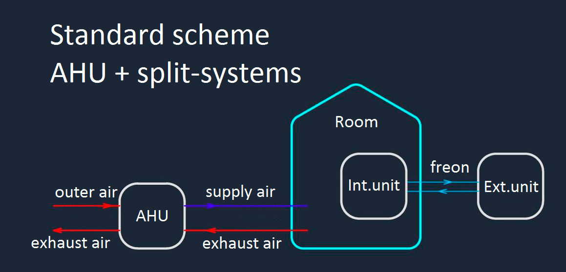 Classical air conditioning circuit expects the placement of unified air handling units (central air conditioners) serving the room. At the same time, outer air is processed in the central air conditioner and is supplied prepared into the serviced room. To heat up the supply air, heaters are used, and to cool the supply air, air cooling sections are used; these air cooling sections usually use a freon system as a source of cold (chiller or compressor-condensing unit).