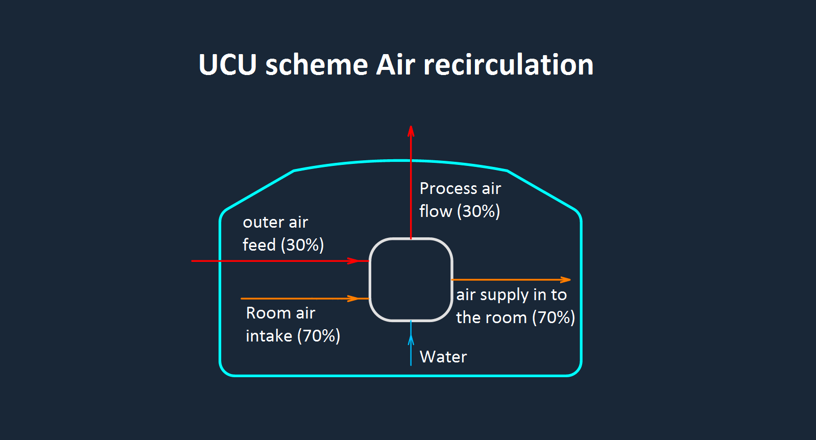 This operation circuit is similar to the circuit Central air conditioner – Chiller (Compressor-condensing unit). The refrigeration machine is excluded. It is required to include an additional air duct in the system to relieve heat when cooling the air, a process air duct. The air consumption in the process air duct is 30% of the air delivered into the unit. The air flow delivered to the consumer is 70% of the air delivered into the unit. In winter, the process air flow is blocked, and the airflow for the consumer is adjusted in accordance with the specified winter parameters.